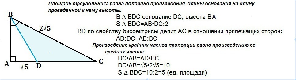 В треугольнике ABC. BD биссектриса угла B, угол А= 90градусов, АD=корень из 5, ВС= 2 корня из 5 . Найти площадь BDC