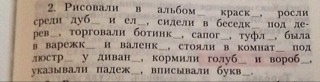 В альбомах ( в чём ? падеж п.) Краски (в чём?) предложный п.,Дубов (чего?) родительный ,в беседке (в чём) п.п.,Деревьями (чем?) т.п.,ботинки (что?) винительный ,сапоги туфли валенки всё винительный падеж, комнатах (в чем) предложный ,люстры винительный диваны винитетельный ,воробьи (что) винитльный ,падежы винительный ,буквы винительный