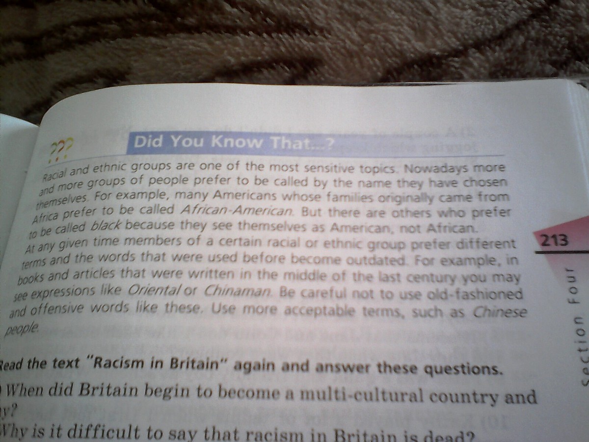 Расовые и этнические группы являются одной из важнейших тем. На сегодняшний день всё больше и больше групп людей предпочитают называться именем, которое они выбрали сами. Например, многие американцы, чьи корни уходят в Африку, предпочитают называть себя афро-американцами. Но есть и другие, которые предпочитают называть себя чёрными, потому что они видят себя американцами, а не африканцами. В другие эпохи этнические группы назывались по другому. Например, в книгах, написанных в середине прошлого столетия, вы можете найти такие выражения как восточный или китайский человек (дословный перевод, как то так кажется). Будьте осторожны и не используйте эти старомодные выражения. Используйте более привычные термины, такие как китайцы. (Фух... не входит в текст=)