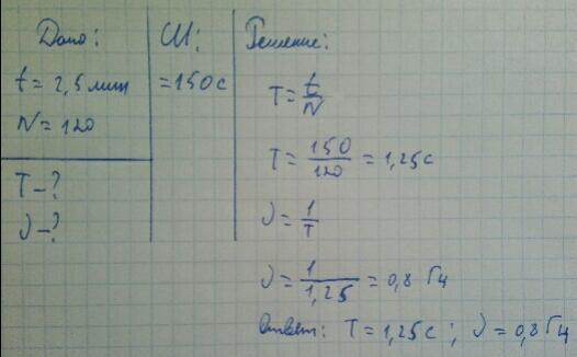 Материальная точка за 2.5 минут совершила 120 полных колебаний. Определить период и частоту колебаний.