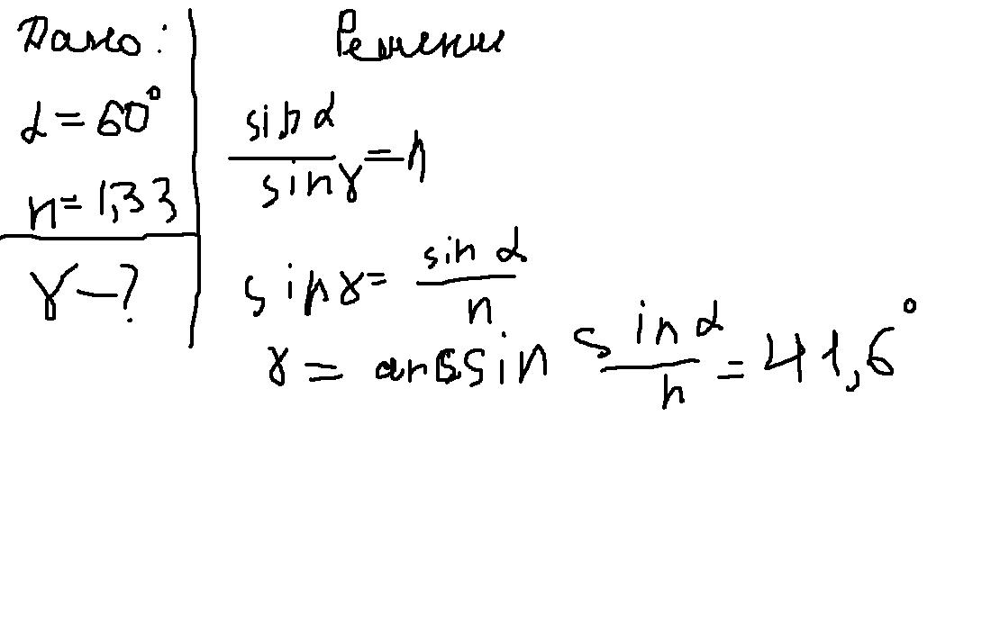 Луч света переходит из воздуха в воду.угол его падения равет 60 градусов .найдите угол преломления .показатель преломления воды равет 1.333...