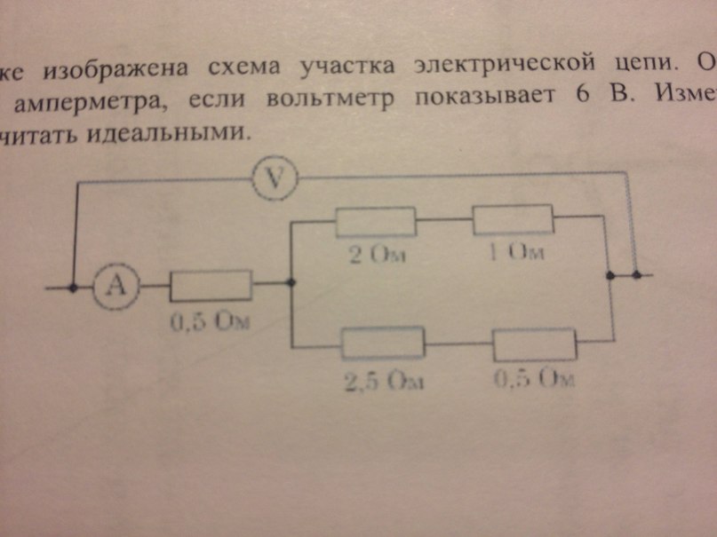 2. На рисунке изображена схема участка электрической цепи. Определите показание амперметра, если вольтметр показывает 6 В. Измерительные приборы считать идеальными.