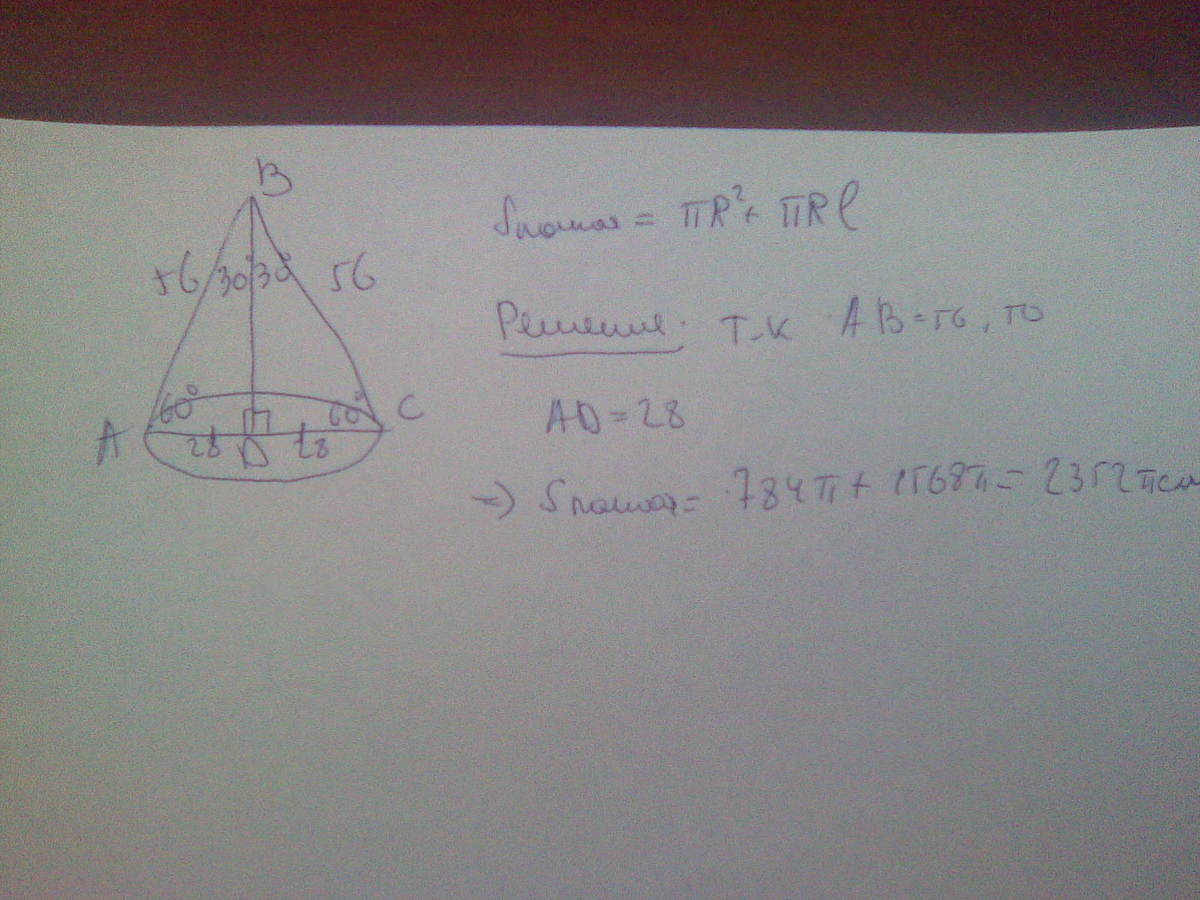 найдите площадь полной поверхности конуса если его образующая равна 56 см, а угол между высотой и образующей 30 градусов.