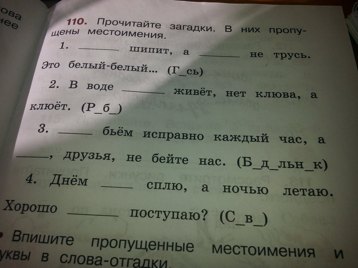 он шипит, а ты не трусь. В воде она живет...Мы бьем... А вы... Днем я сплю.... Хорошо-ли
