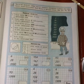Прочитай правила,найди листок каждого человечка и выпиши его имя. Какие числа выписывает Вик?Выпиши в фигуры числа:104,251,93,28.