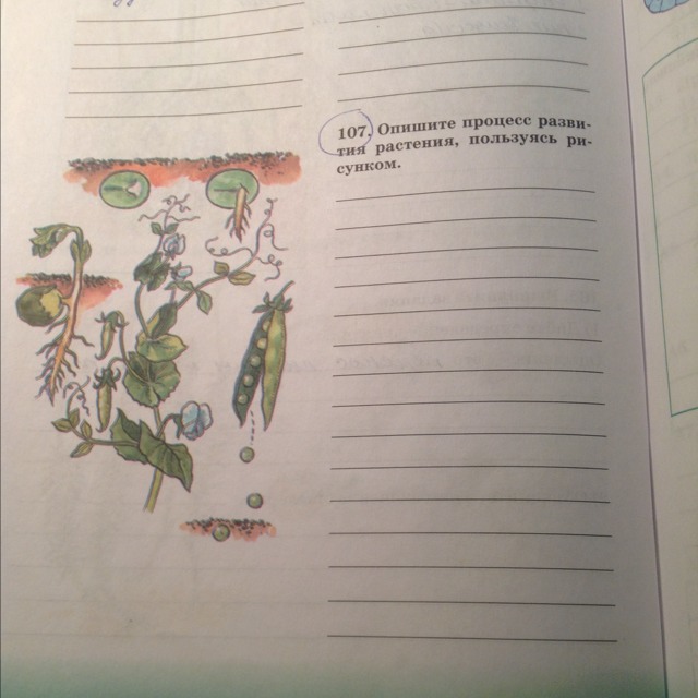 Сначала садим зерно,потом вырастает росток,затем он становится больше, и выростает горох!)