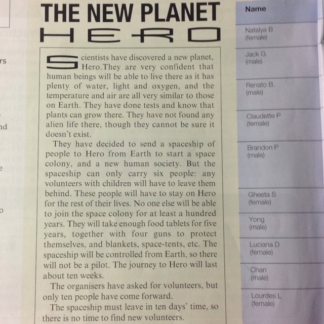 ученые обнаружили новую планету. Герой. Они очень уверены, что люди смогут жить там, как это много воды, света и кислорода, а температура и воздух все очень похожи на те, на Земле. Они сделали тесты и знать, что растения могут расти там. Они не нашли никаких инопланетной жизни там, хотя они не могут быть уверены, что он не существует Они решили отправить космический корабль людей Герою от Земли, чтобы начать космическую колонию, и новый человеческое общество. Но корабль может нести только шесть человек: любые добровольцы с детьми придется оставить их позади. Эти люди должны будут остаться на Героя для остальной части их жизни. Никто другой не сможет присоединиться к космической колонии, по крайней мере сто лет. Они будут принимать достаточно таблетки пищевые в течение пяти лет, вместе с четырьмя пушками, чтобы защитить себя, и одеяла, космических палатках и т.д. Космический корабль будет управлять с Земли, так что не будет летчиком. Путешествие Герою продлится около десяти недель. Организаторы попросили добровольцев, но только десять человек пришли вперед корабль должен выйти в десять дней, так что нет никакого времени, чтобы найти новых волонтеров