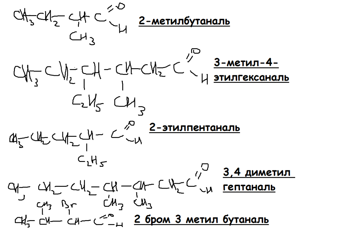 напишите структурные формулы следующих альдегидов:2-метил бутаналь;3-метил-4-этил гексаналь;2-этилпенталь;3,4-диметил гептаналь;2-бром-3-метилбутаналь