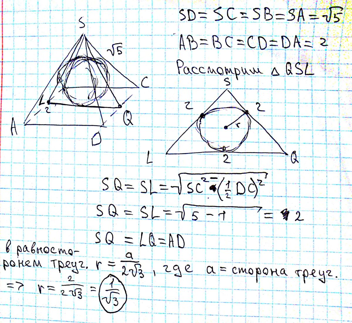 в правильную четырехугольную пирамиду SABCD вписана сфера. найдите ее радиус , если ab=2, sd=кореньиз5