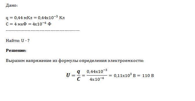 От какого напряжения нужно зарядить конденсатор емкостью 4 мкФ, чтобы ему сообщить заряд 0,44 мКл