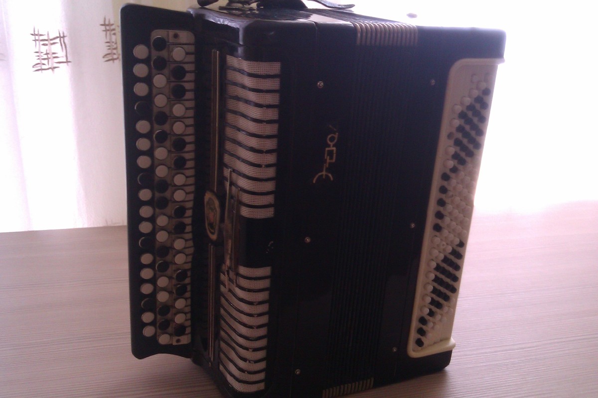 баян выглядит с двух сторон с кнопками, черно белого цвета, так же на нем есть мех с помощью которого издаються звуки.На баяне можно играть народная музыка.