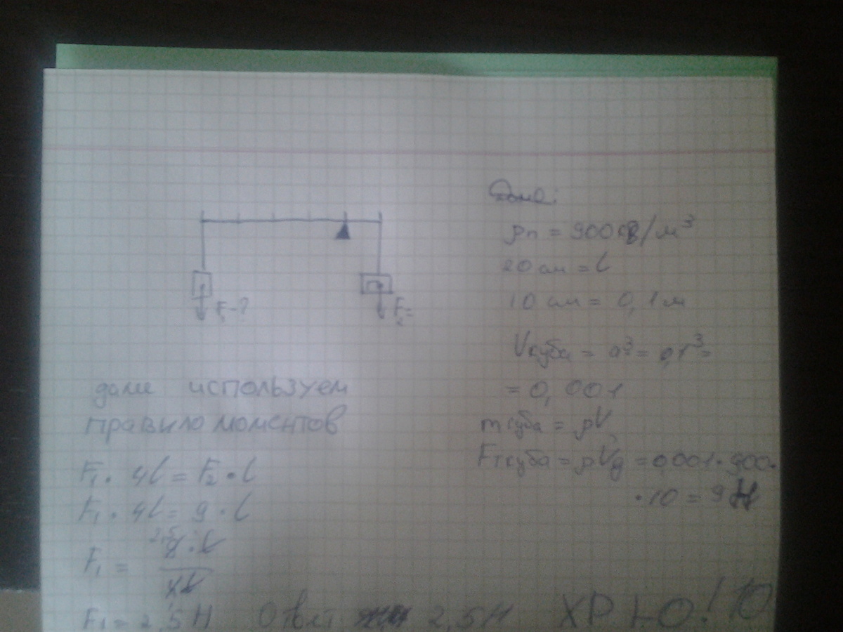К короткому плечу рычага подвешен куб из парафина, ребро которого 10 см. какую силу нужно приложить к длинному плечу чтобы уравнить рычаг? Длина рычага 1м, длина коротко го плеча 20 см.