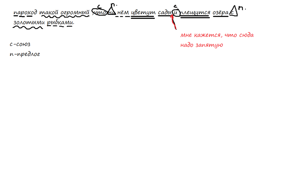 Произведите синтаксический разбор предложения:пароход такой огромный ,что на нём цветут сады и плещутся озёра с золотыми рыбками.