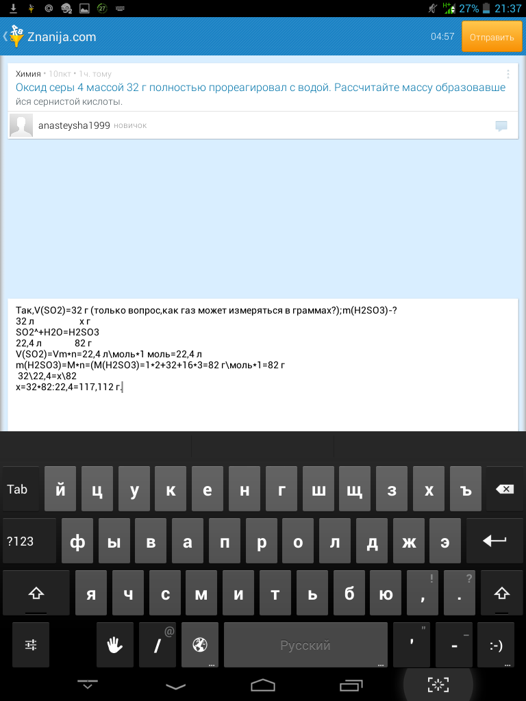 Оксид серы 4 массой 32 г полностью прореагировал с водой. Рассчитайте массу образовавшейся сернистой кислоты.