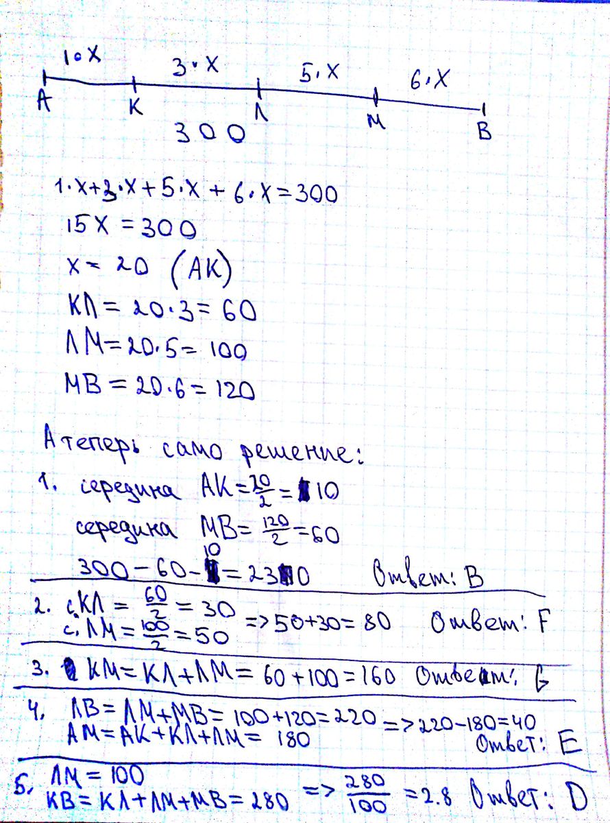 На отрезке АВ последовательно(друг за другом)отложены точки К Л М так ,что АК:КЛ:ЛМ=1:3:5:6 известно что длина отрезка АВ равна 300.Установите соответствие между вопрос и ответом.Некоторые буквы из нижнего столбца могут не использоваться.