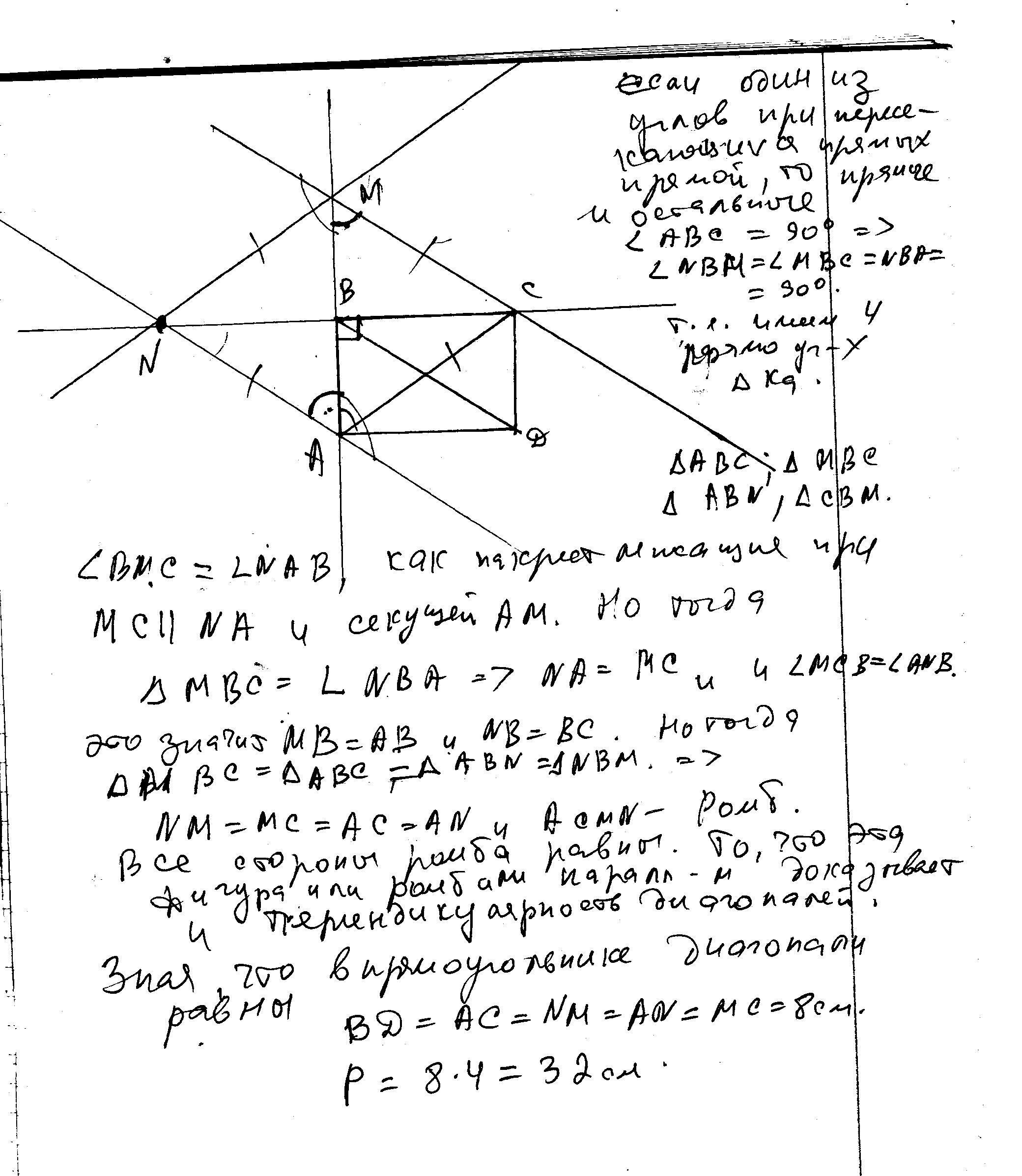 Через вершину C прямоугольника ABCD проведена прямая, параллельная диагонали BD и пересекающая пряму AB в точке M. Через точку M проведена прямая, параллельная диагонали AC и пересекающая прямую BC в точке N. Найдите периметр четырехугольника ACMN, если диагональ BD равна 8 см.