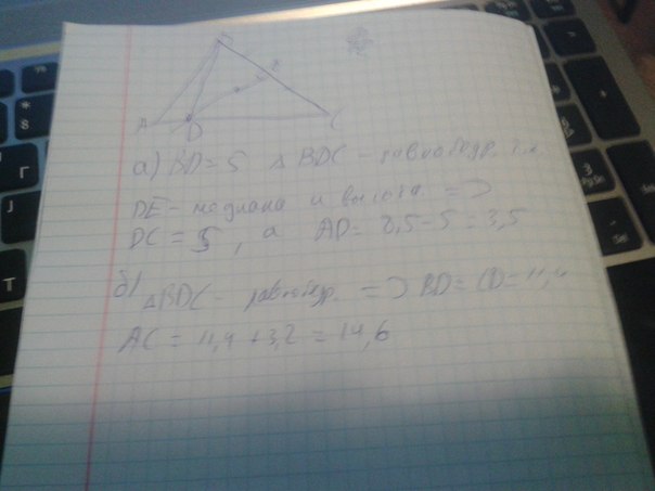 Серединный перпендикуляр к стороне BC треугольника ABC пересекает сторону AC в точке D. Найдите: а) AD и CD, если BD=5 см, AC=8.5 см; б) AC, если BD=11.4 см, AD=3.2см