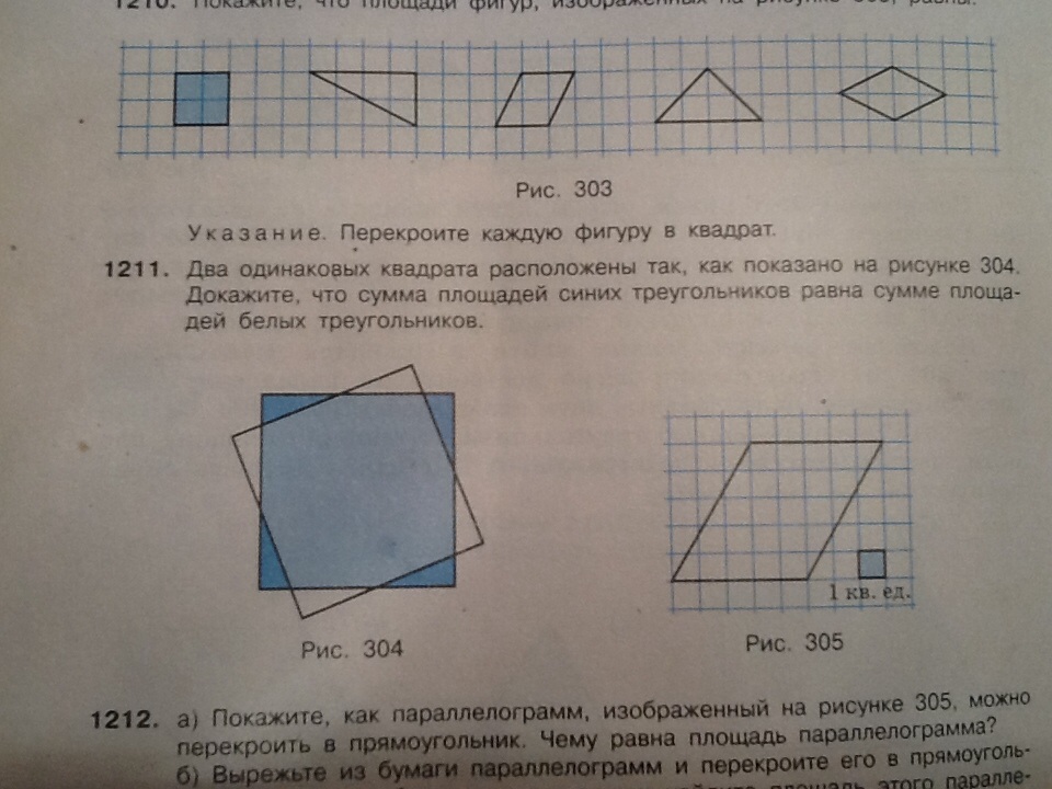 Два одинаковых квадрата расположены так, как показано на рисунке 304. Докажите, что сумма площадей синих треугольников равна сумме площадей белых треугольников.