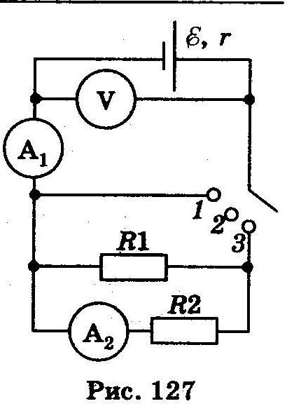 Что покажут амперметры и вольтметр (рис. 127) при положениях переключателя 1, 2, 3, если ЭДС источника = 6 В, его внутреннее сопротивление г = 1,2 Ом, R1 = 8 Ом и R2 = 4,8 Ом?
