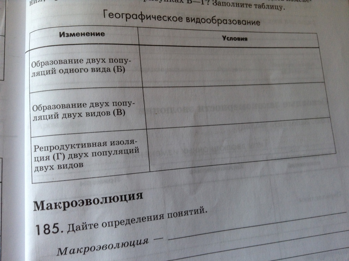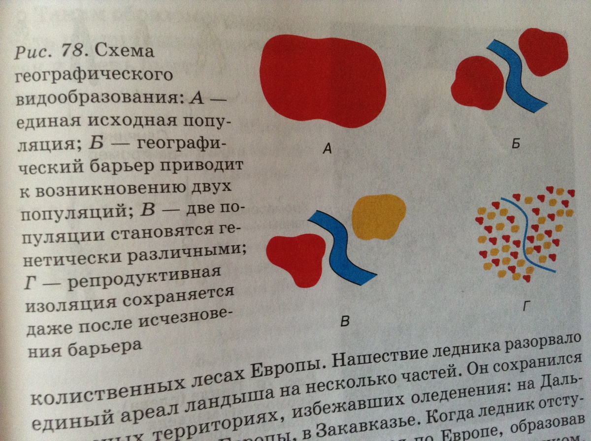 Рассмотрите схему географического видообразования. Как вы думаете, при каких условиях будут происходить изменения на рисунках Б и Г? Заполните таблицу.