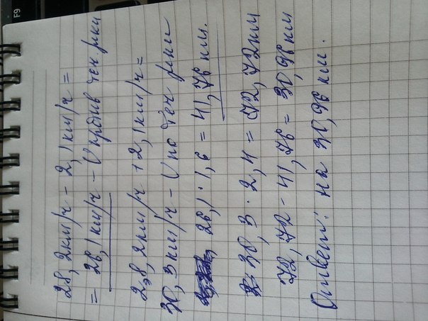 Катер плыл 1,6 часа против течение реки и 2,4 часа по течению. На сколько больше плыл катер двигаясь по течению реки чем против течения если скорость равна 2,1 кмч а собственная скорость катера 28,2 кмч