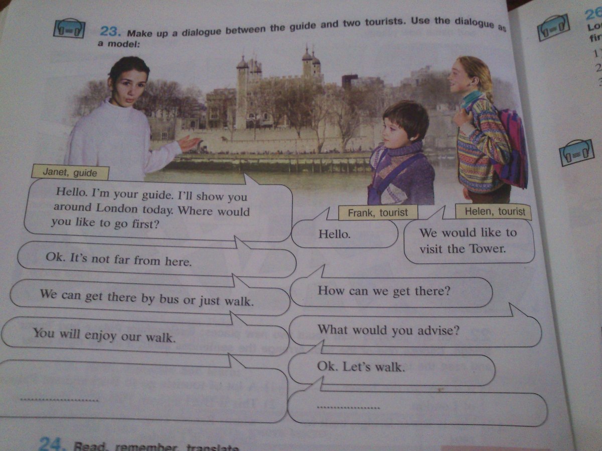 Составьте диалог между гидом и двумя туристами. Используйте в качестве образца этот диалог на картинке.