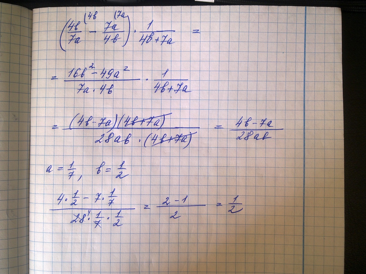 Упростите выражение (4b/7a−7a/4b)⋅1|4b+7a и найдите его значение при a=1/7, b=1/2. В ответе запишите найденное значение.