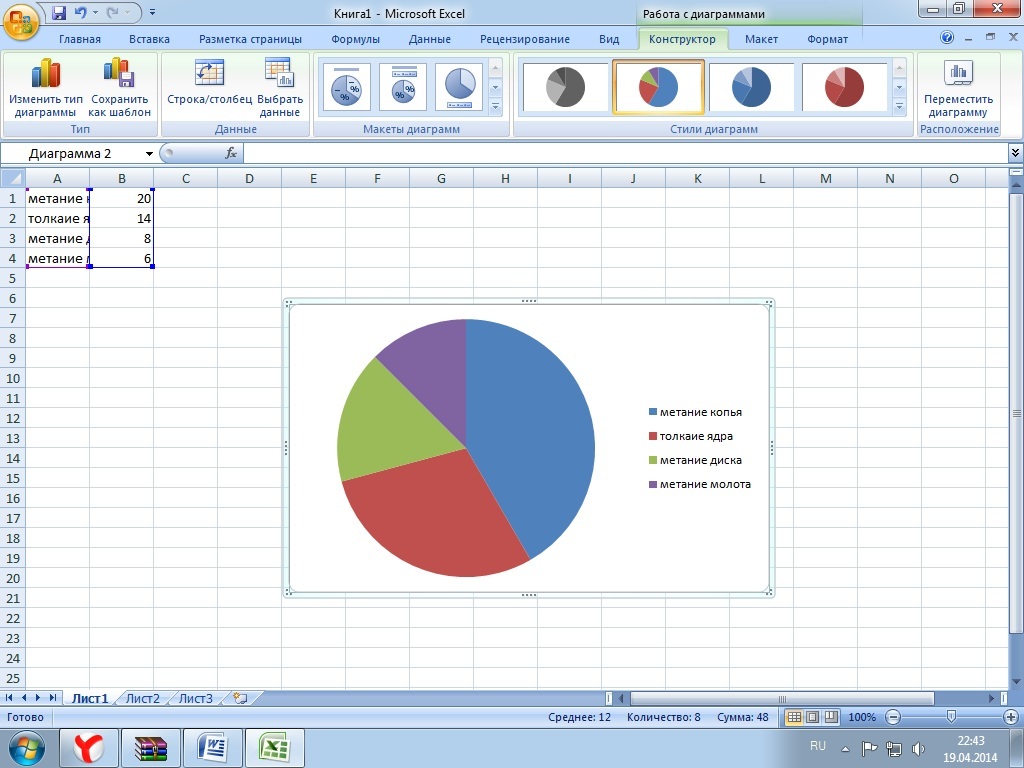 постройте по информации содержащейся в таблице круговую диаграмму распределения участников соревнований по метательным видам легкой атлетики. известно что каждый спортсмен выступал только в одном виде .