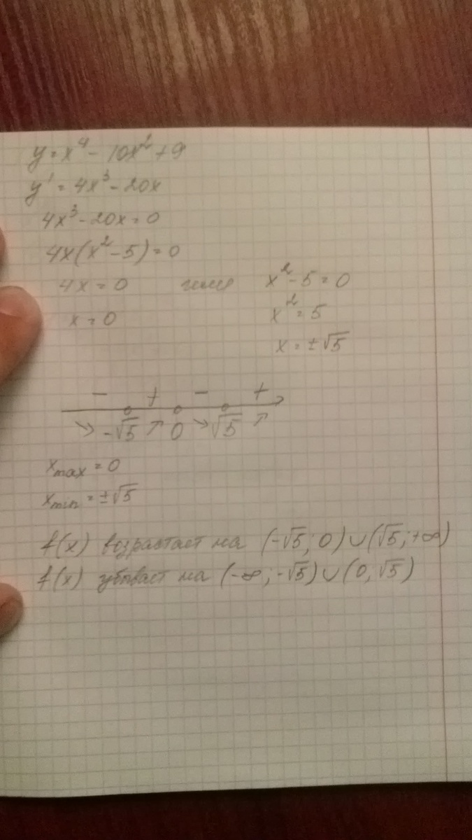 исследуйте функцию y=x^4-10x^2+9 на монотонность и экстриумы и определите их характер (напишите на лист)