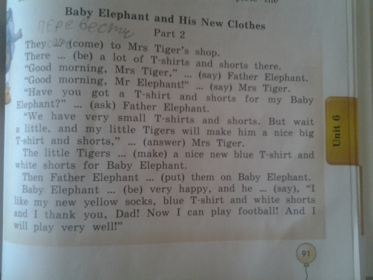 Затем мистер Слон одел их на слонёнка. Слонёнок был очень рад и сказал : "Мне нравятся мои новые жёлтые носки, голубая футболка и белые шорты, и я благодарю тебя папа! Теперь я могу играть в футбол! И я буду играть очень хорошо!"