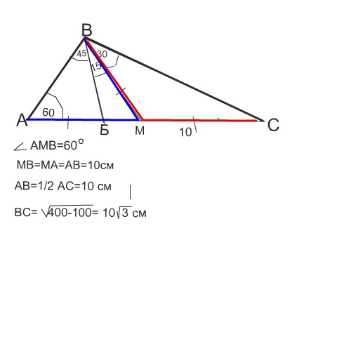 у прямокутному трикутнику гіпотенуза дорівнюе 20см а кут між бісектрисою і медіаною які проведено з вершини прямого кута 15 градусів.Знайти катети трикутника