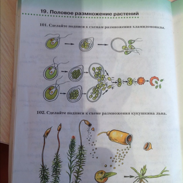 Хламидомонада. первая схема - размножение бесполым путём, вторая половым.