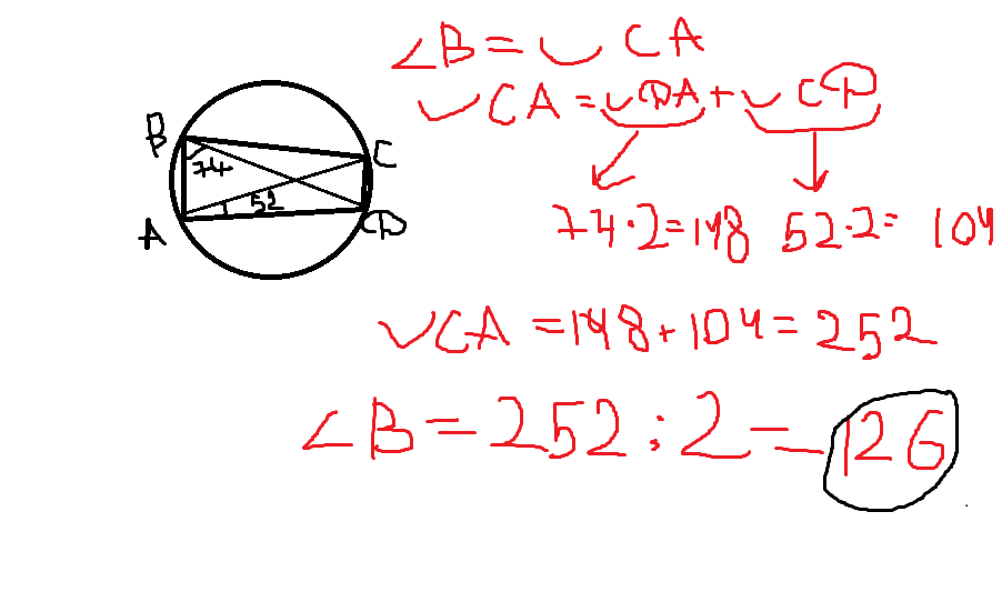 Четырехугольник АВСD вписан в окружность.Угол АВD равен 74 градусов , угол САD равен 52 . Найдите АВС.Ответ должен быть получится 126 , но мне нужно правильное решение.
