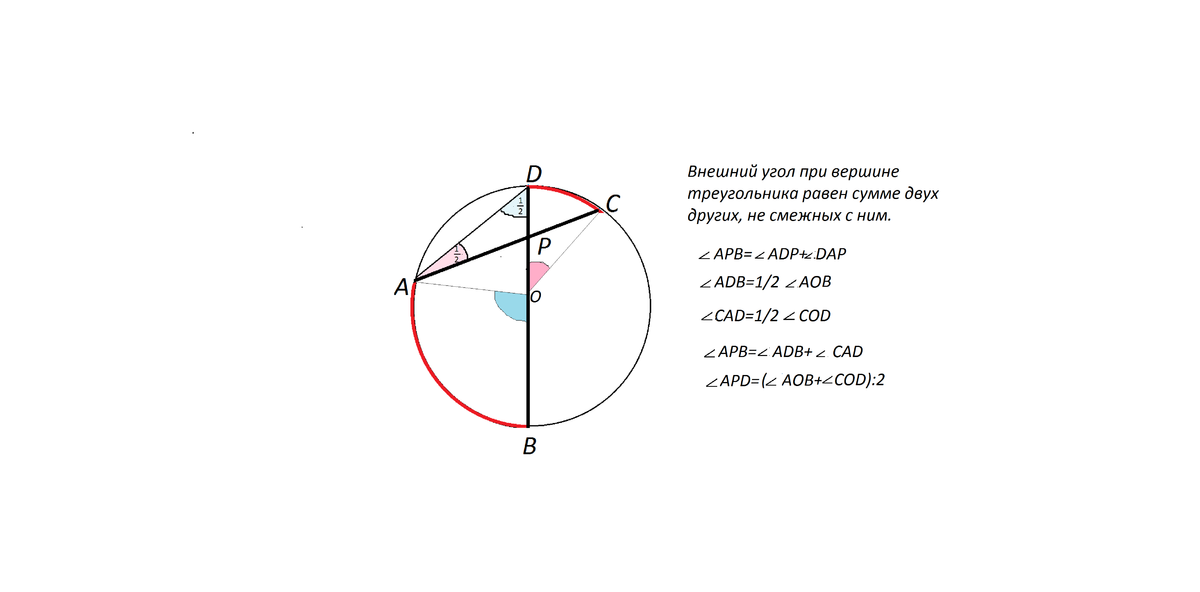 Следовательно, угол АРВ, равный сумме углов АДВ и ДАС, равен полусумме угловых величин дуг АВ и СД.