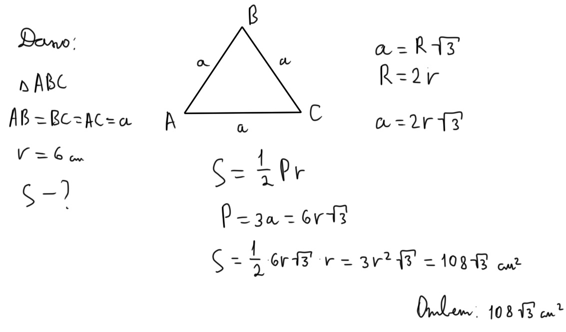 радиус окружности ,вписанной в правильный треугольник ,равен 6 см.вычислить площадь треугольника.