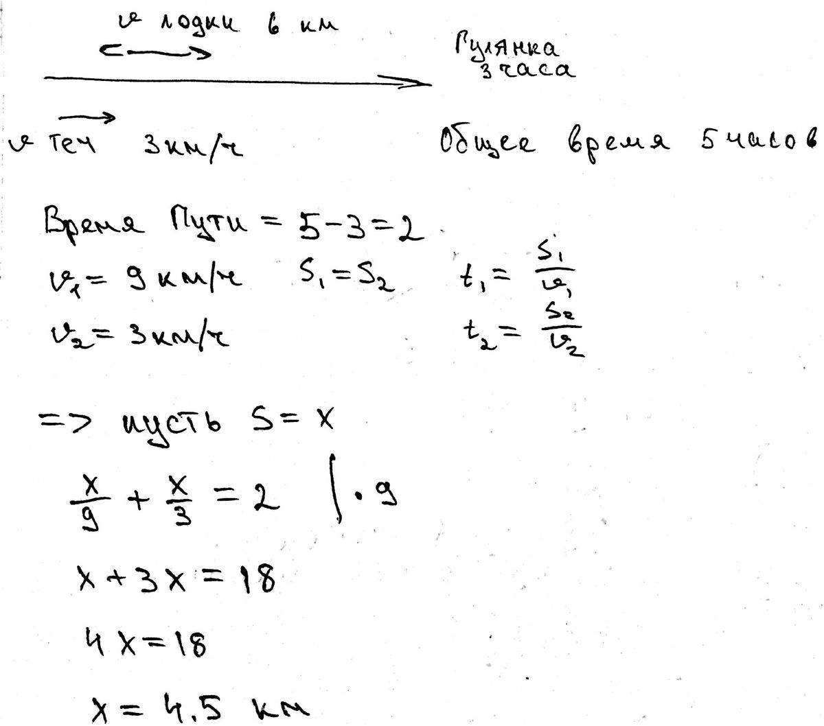 Туристы проплыли на лодке от лагеря некоторое расстояние вверх по течению реки, затем причалили к берегу и, погуляв 3 часа, вернулись обратно через 5 часов от начала путешествия. На какое расстояние от лагеря они отплыли, если скорость течения реки равна 3 км/ч, а собственная скорость лодки 6 км/ч?