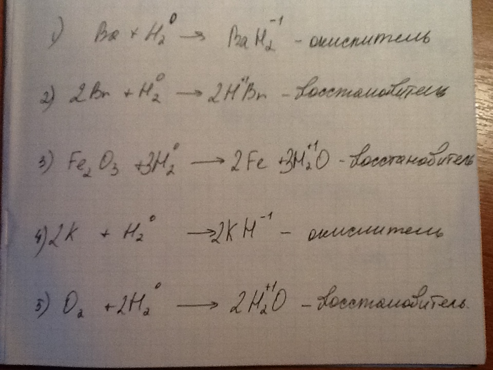 пожалуйста помогите..напишите уравнение реакции взаимодействия водорода с барием,бромом,оксидом железа(3),калием,кислородом,Укажите,в каких реакциях водород окислитель,а каких восстановитель.