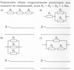 Определите общее сопротивление резисторов для каждого из соединений если R1=R2=R3=1 ом