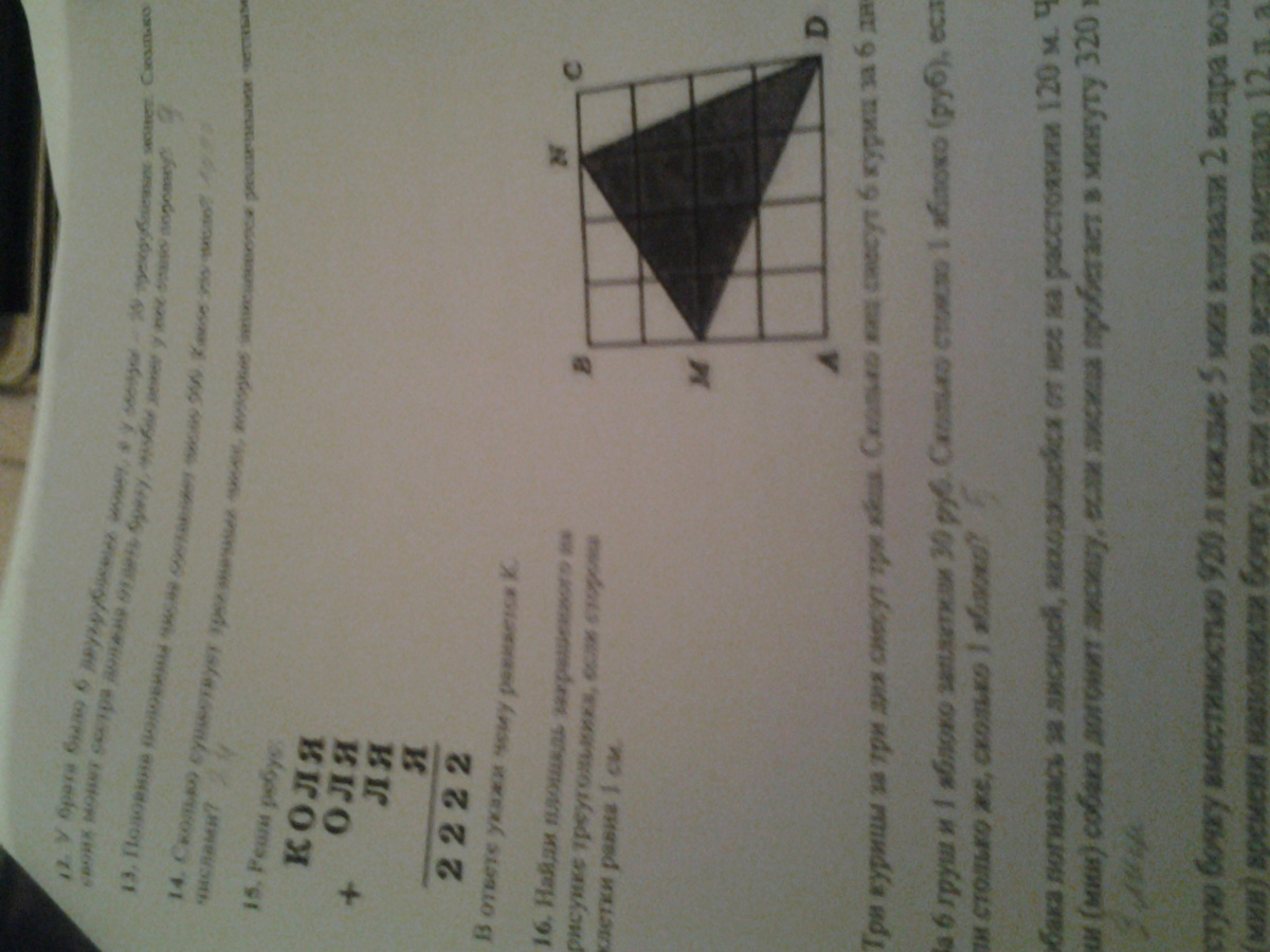 Помогите прошу умоляю 4 часа сижу уже номер 15 ии16 номер 16 там найди площадь закрашеного на рисунке треугольнике если сторона клетки равна 1 см 15 в ответе у кажи чемуу равняется К