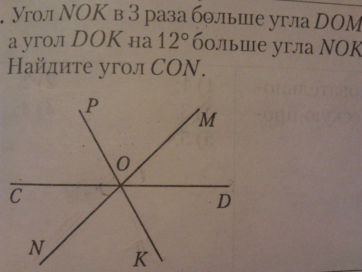 DOM - берем за х. сумма NOK DOK и DOM должна равняться 180°, т.к. они смежные. NOK = 3x DOK= 3x + 12