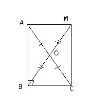 Рассмотрим прямоугольный треугольник ABC (угол B - прямой, BO - медиана). Продолжим BO, на линии отложим отрезок равный BO: OM (рисунок прилагается). Соединим точку M с точками A и C. Получится четырехугольник ABCM. Рассмотрим треугольники AOM и COB: