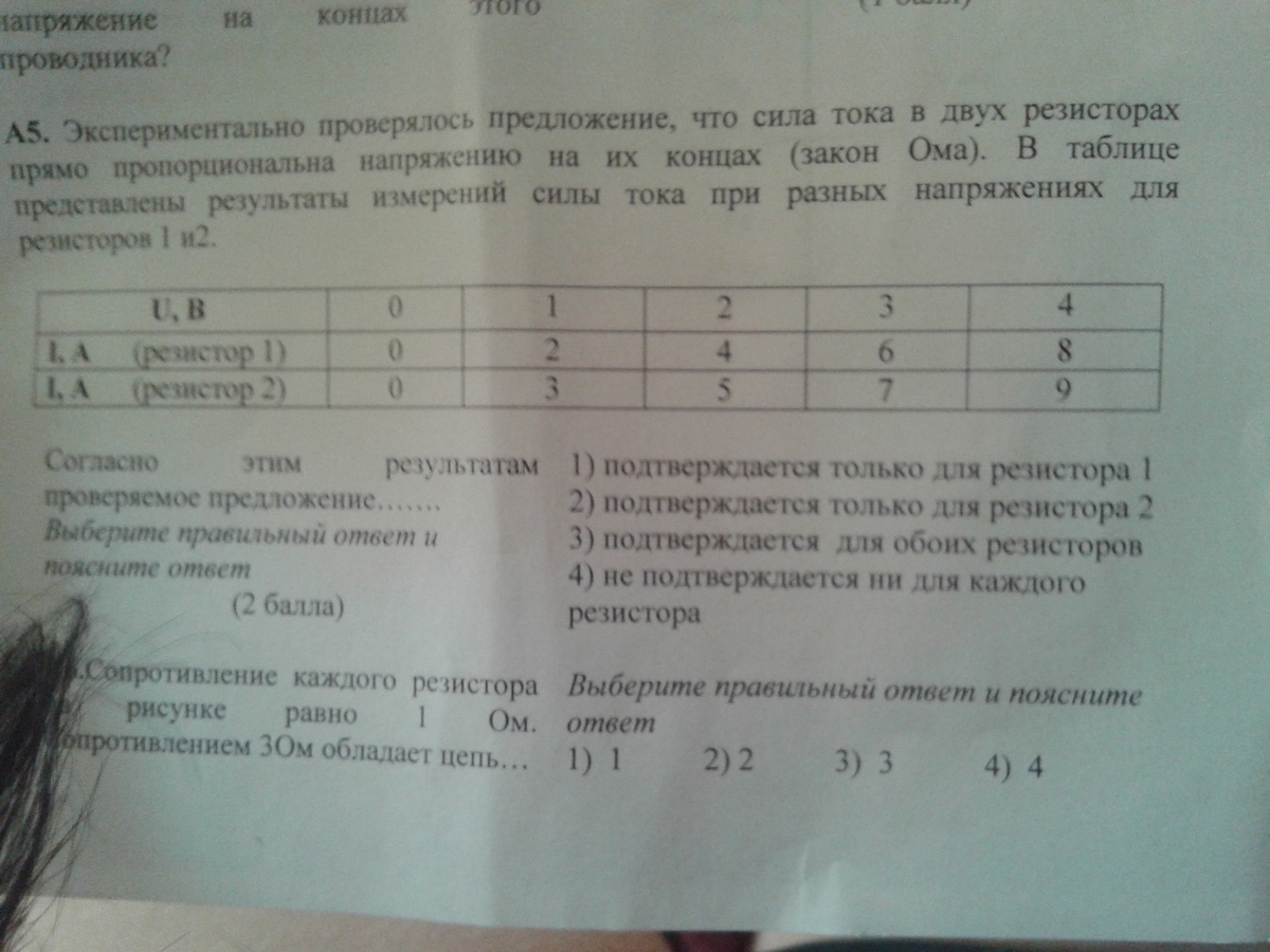 Экспериментально проверялось предложение, что сила тока в двух резисторах прямо пропорциональна напряжению на их концах (закон Ома). В таблице представлены результаты измерений силы тока при разных напряжениях для резисторов 1 и2.