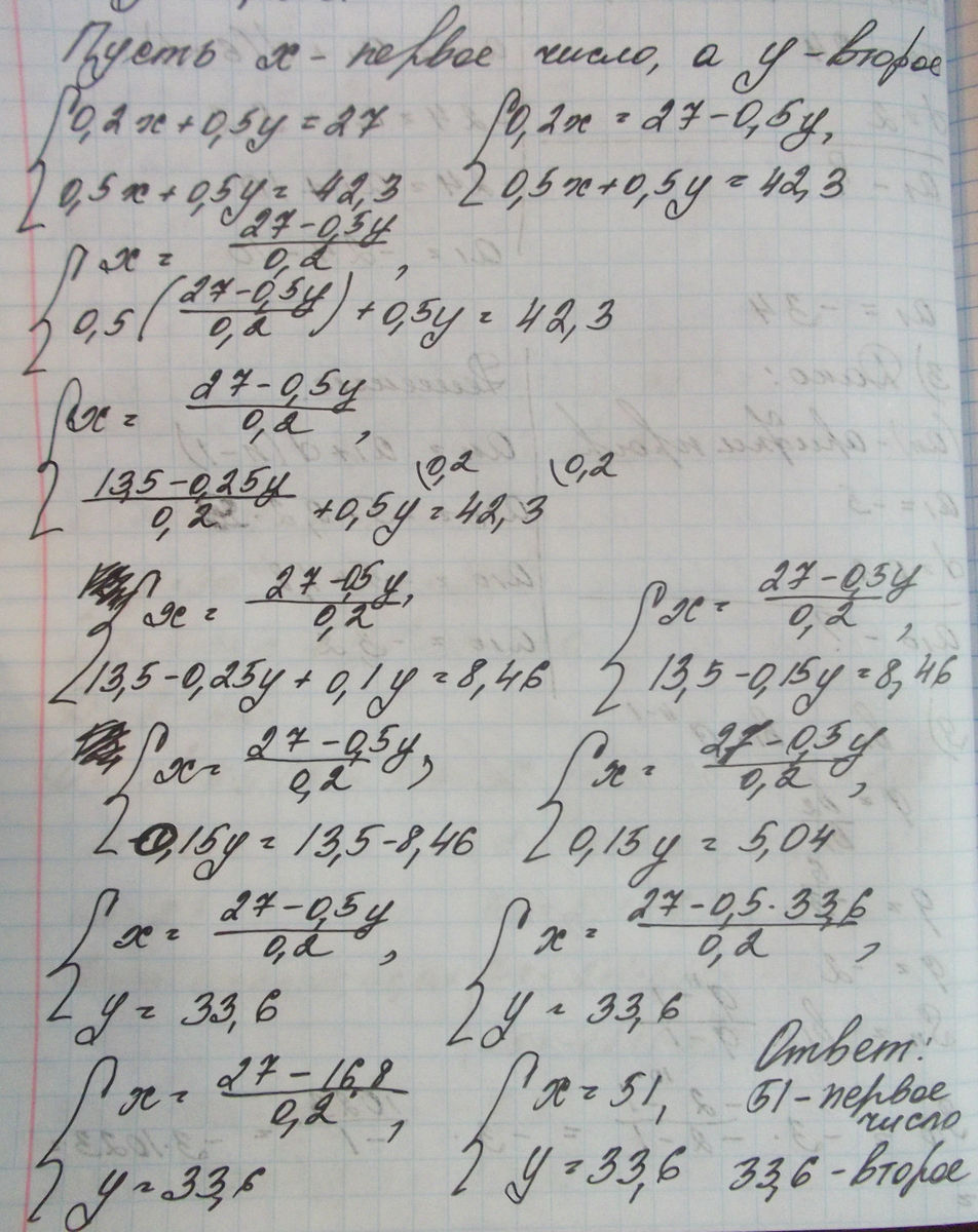 20 % одного числа и 50 % другого вместе составляют 27, а 50 % первого числа и 50 % второго вместе составляют 42, 3. Найдите эти числа