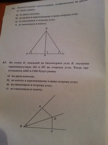 А6 в (если углы при основании равны, значит треугольник равнобедренный), А7 в. (BD общая сторона)