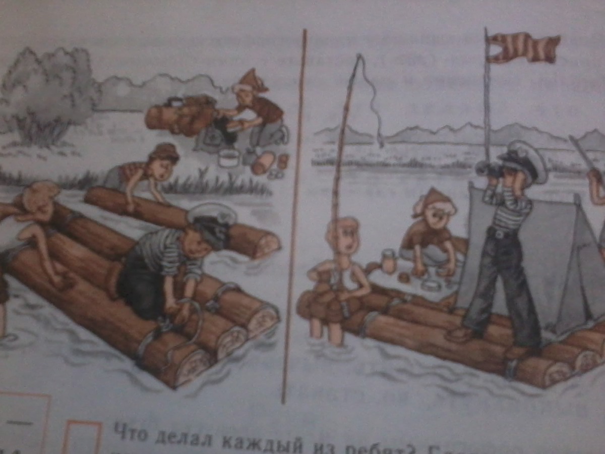 собрались мальчики гулть вместе,решили они по реке проплыть на своём построенном плоту.плавали,плавали и тут увидели что-то шевелиться в траве...ну а там придумаешь что-нибудь))