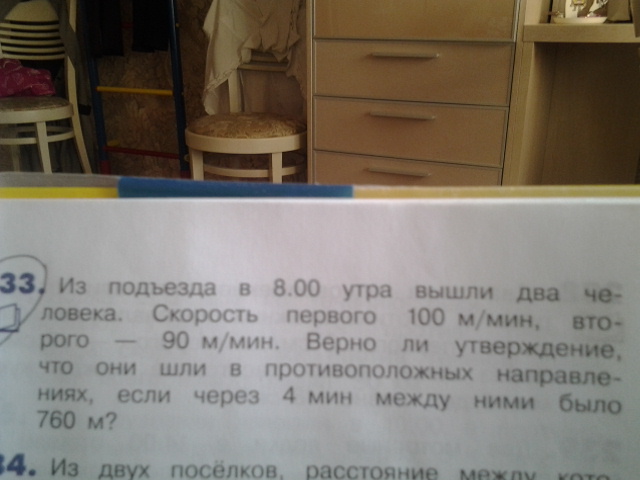 из подъезда в 8:00 утра вышли два человека.Скорость первого 100 м/мин,второго 90 м/мин.Верно ли утверждение,что они шли в противоположных направлениях,если через 4 мин между ними было 760 м?