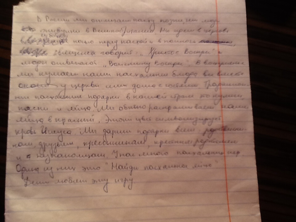 В россии мы отмечаем пасху позже чем в Великобритании. Мы идем в церковь в субботу ночью перед самой пасхой и в полночь священник говорит ХРИСТОС ВОСКРЕС а люди ему отвечают ВОИСТИНУ ВОСКРЕС. В воскресенье мы кушаем наши пасхальные блюда все вместе у церкви или дома с гостями. Традиционные пасхальные подарки в нашей стране это куличи, пасхи и яйца. Мы обычно раскрашиваем яйца в красный цвет. Это символизирует кровь Иисуса. Мы дарим подарки всем: родственникам, друзьям, крестникам, крестным родителям и незнакомцам. У нас много пасхальных игр. Одна из них это НАЙДИ ПАСХАЛЬНОЕ ЯЙЦО. Дети очень любят в нее играть.