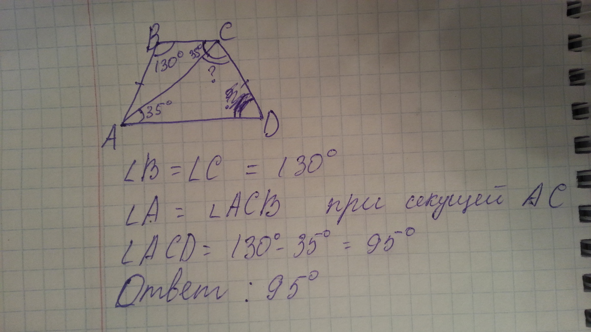 найдите угол acd равнобедренной трапеции ABCD,если диагональ АС образует с основанием AD угол 35 градусов,а большой угол(B) трапеции равен 130