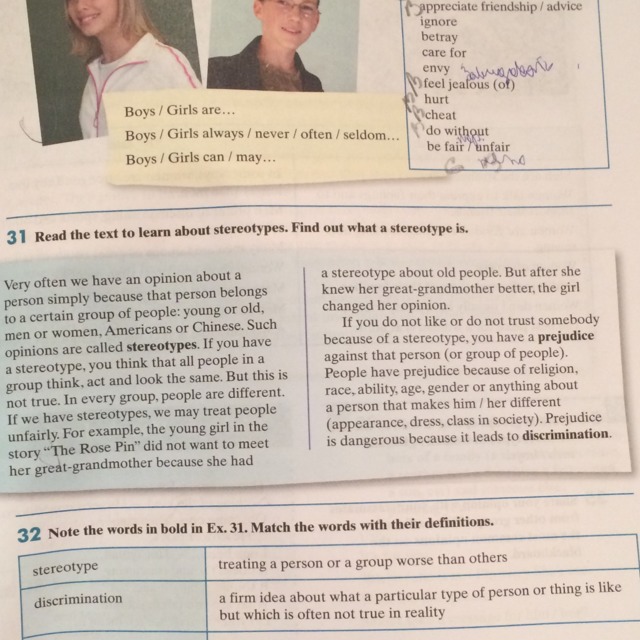 е и выглядите одинаково. Но это не верно. В каждой группе люди отличаются. Если у нас есть стереотипы, мы можем рассматривать людей незаконно. Например, молодая девушка в истории "Поднялась, Булавка" не хотела встречать ее прабабушку, потому что у нее был стереотип о стариках. Но после того, как она знала свою прабабушку лучше, девочка изменила свое мнение.Если Вы не любите или не доверяете кому-то из-за стереотипа, у Вас есть предубеждение против того человека (или группа людей). У людей есть пре