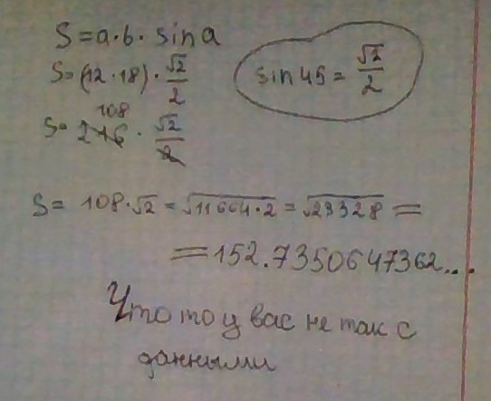 1.Найдите площадь параллелограмма,если его стороны равны 12 см и 18 см,а острый угол между ними 45(градусов).